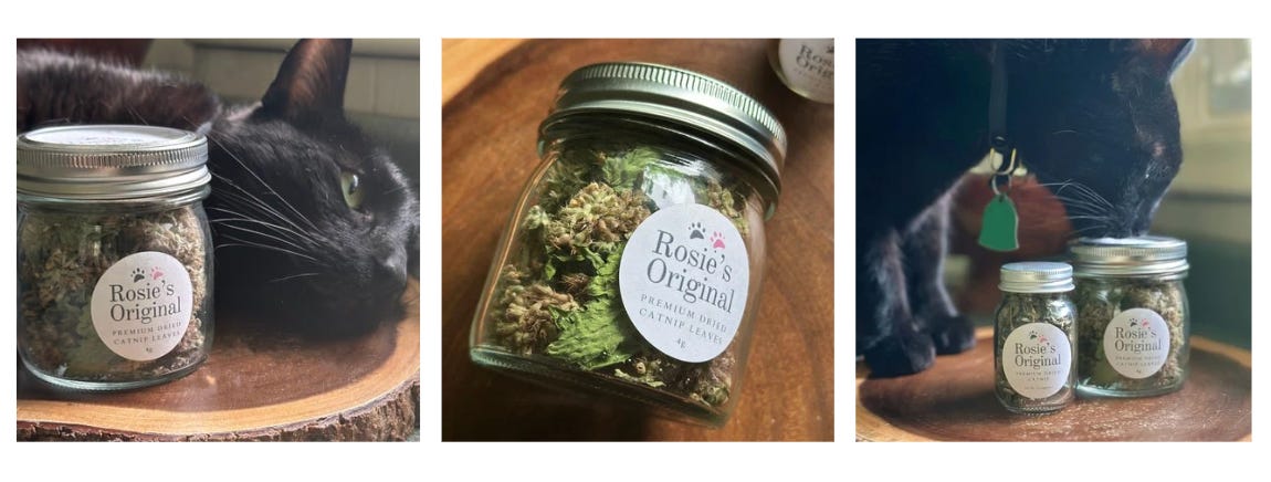Rosie’s is harvested by hand, triple washed and dried, and the leaves and flowers are placed individually on dehydrating trays so that they dry flat and stay whole. The beautiful packaging and thoughtful detail of this catnip brand feels so elevated and special.